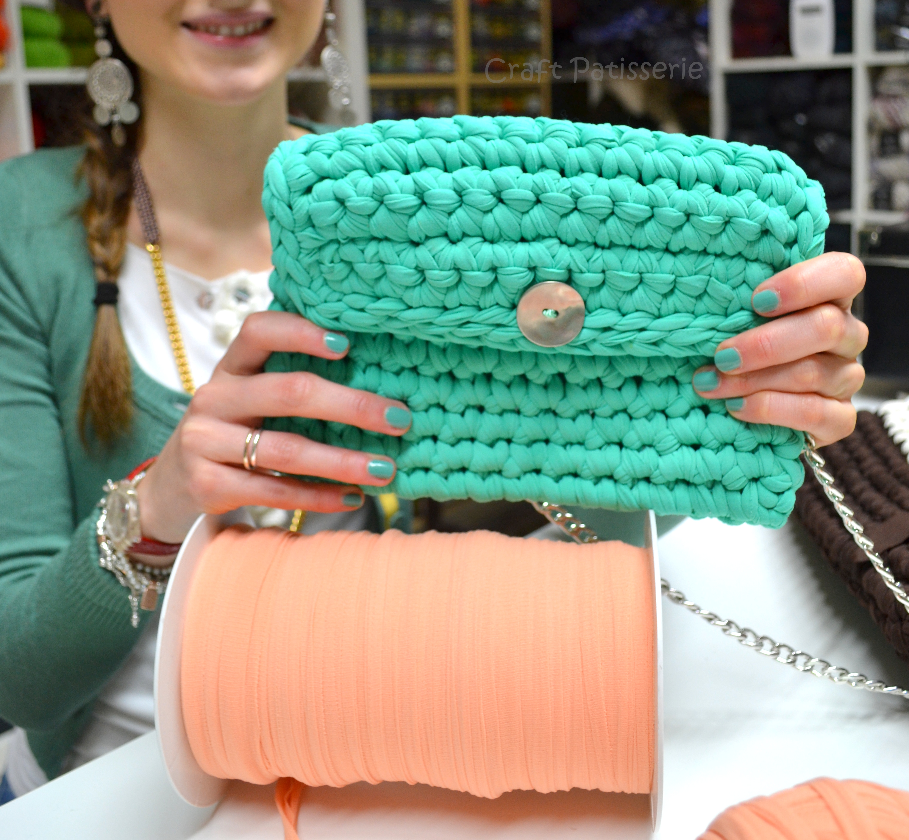 Chiacchierando e uncinettando si è fatta una certa ora e allora decido di continuare a casa… Torno a casa quasi di corsa e … Lungo il tragitto … Negozi e negozietti con le borse in fettuccia da piccole a piccolissime con bijoux o spille sullo stile chic , oppure più etniche con manici di legno e bottoni… La moda spopola e la mia come sarà ?