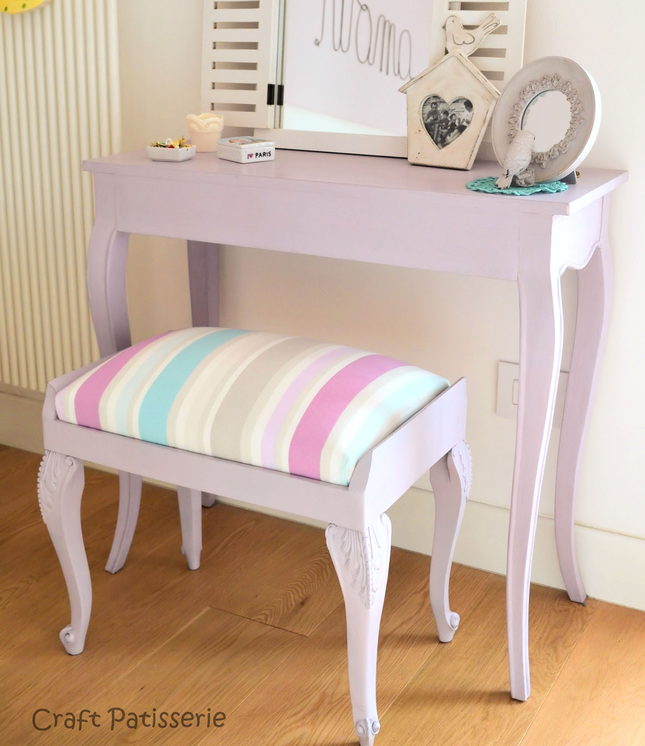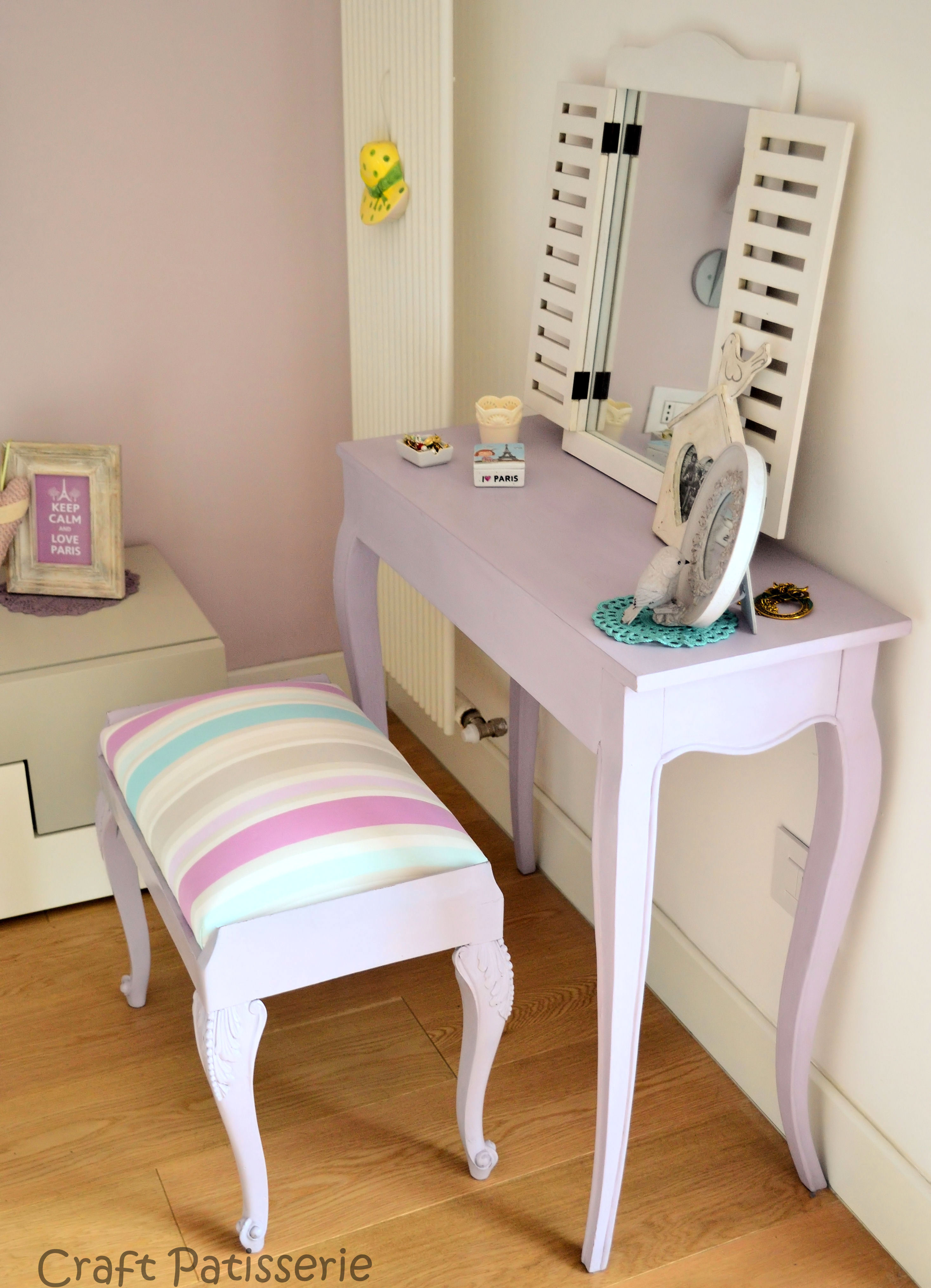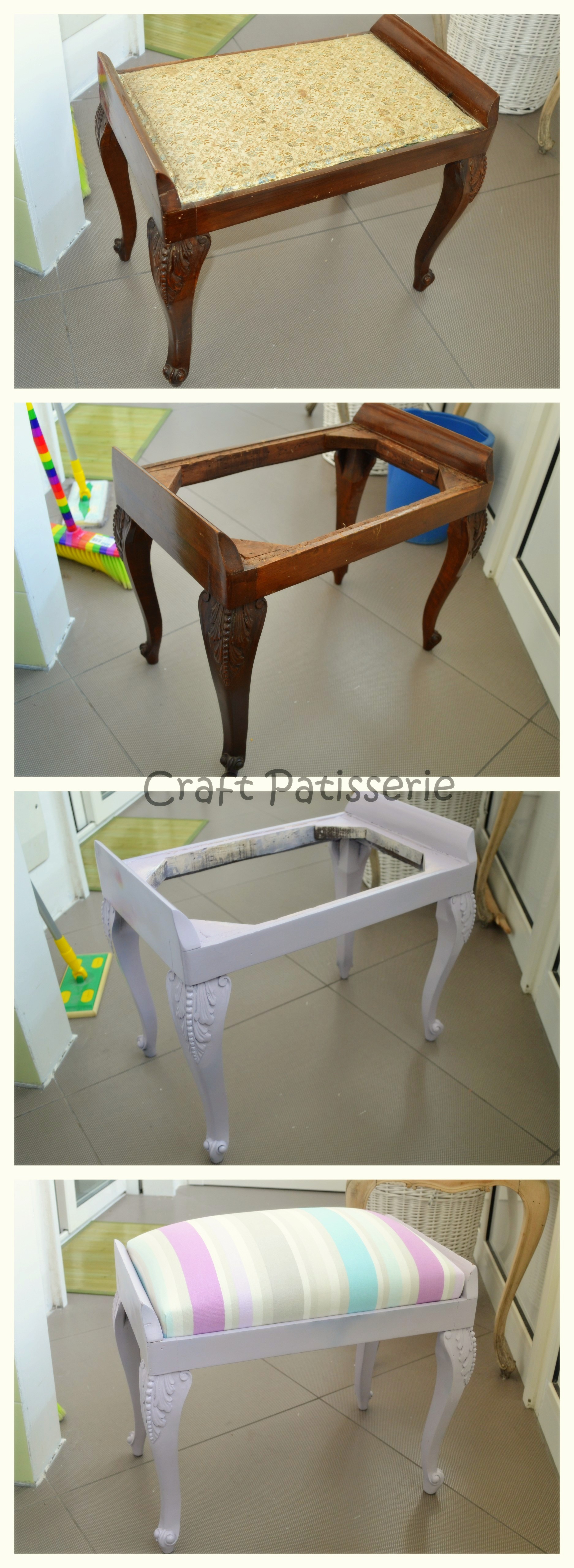 Ciao Amici. Questo post lo preparavo da un pò e finalemte posso pubblicare il risultato finito! Tutto è cominciato con un vecchio o antico pouf di legno e tessuto che mia madre aveva in casa ma di cui voleva disfarsi… Allo stesso tempo io avevo una consolle lilla nella camera da letto senza una seduta…. IDEA! Decido di provare a modernizzarlo e vedere l’effetto… tanto non si perde niente! E poi non mi ero mai cimentata in questi  “interventi” sul mobilio… Quindi ecco gli steps: