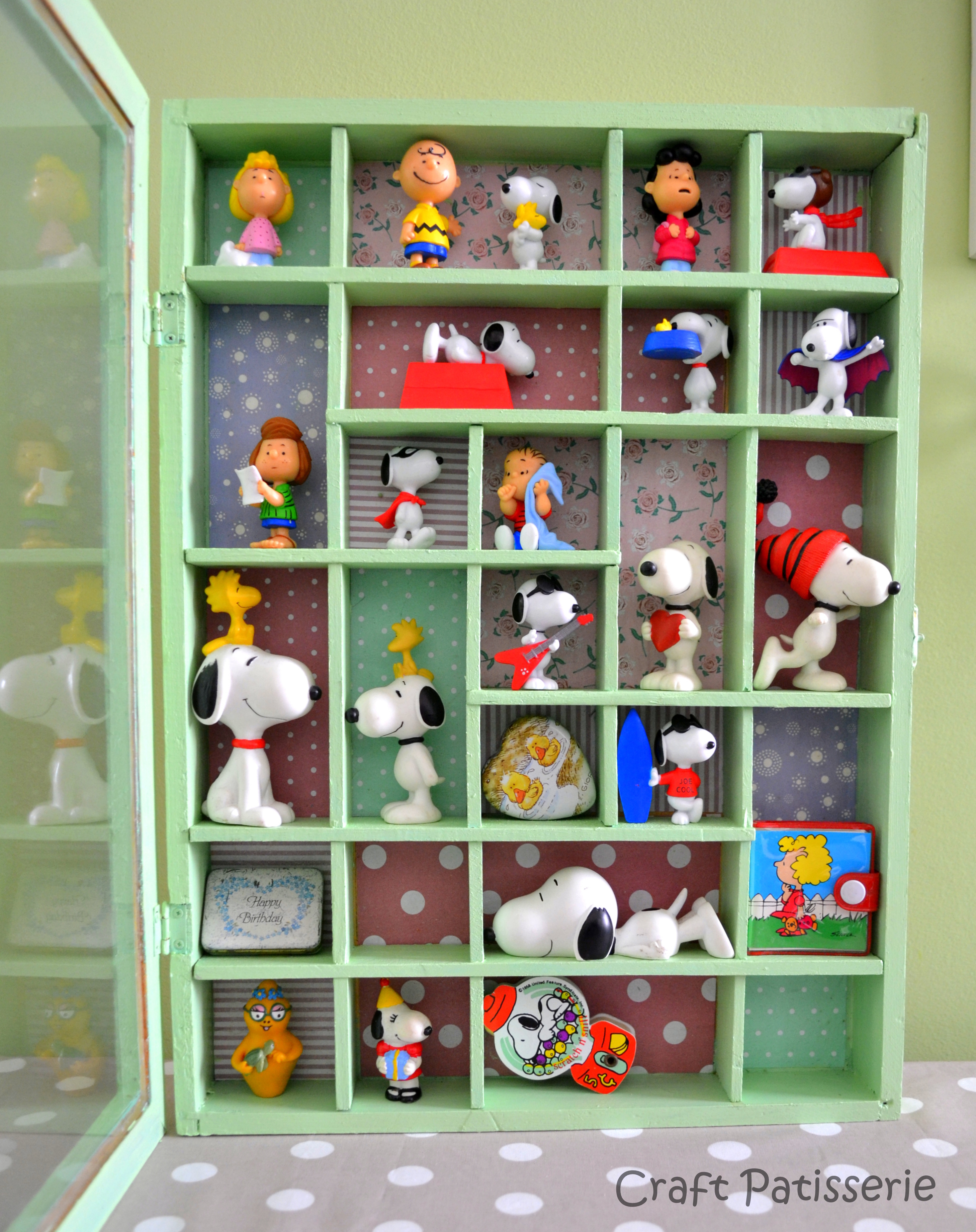 Ora arriviamo la progetto creativo di recupero. Avevo da sempre una bacheca di legno naturale, con la sua anta di vetro. Ho pensato , grazie anche all’ispirazione datami da alcune amiche creative, come la straordinaria Monila Valsecchi ,creatrice di bellissimi decori su ceramica, di rinnovare la bacheca e renderla più colorata per accogliere la mia collezione a cui al momento manca un solo personaggio! Snoopy con la macchina da scrivere! Ho lasciato comunque un posticino libero, continuerò a cercarlo! Che ve ne pare del risultato finale? Ora troverà collocazione nella mia Craft Room che è in costruzione! Kiss Kiss Friends!