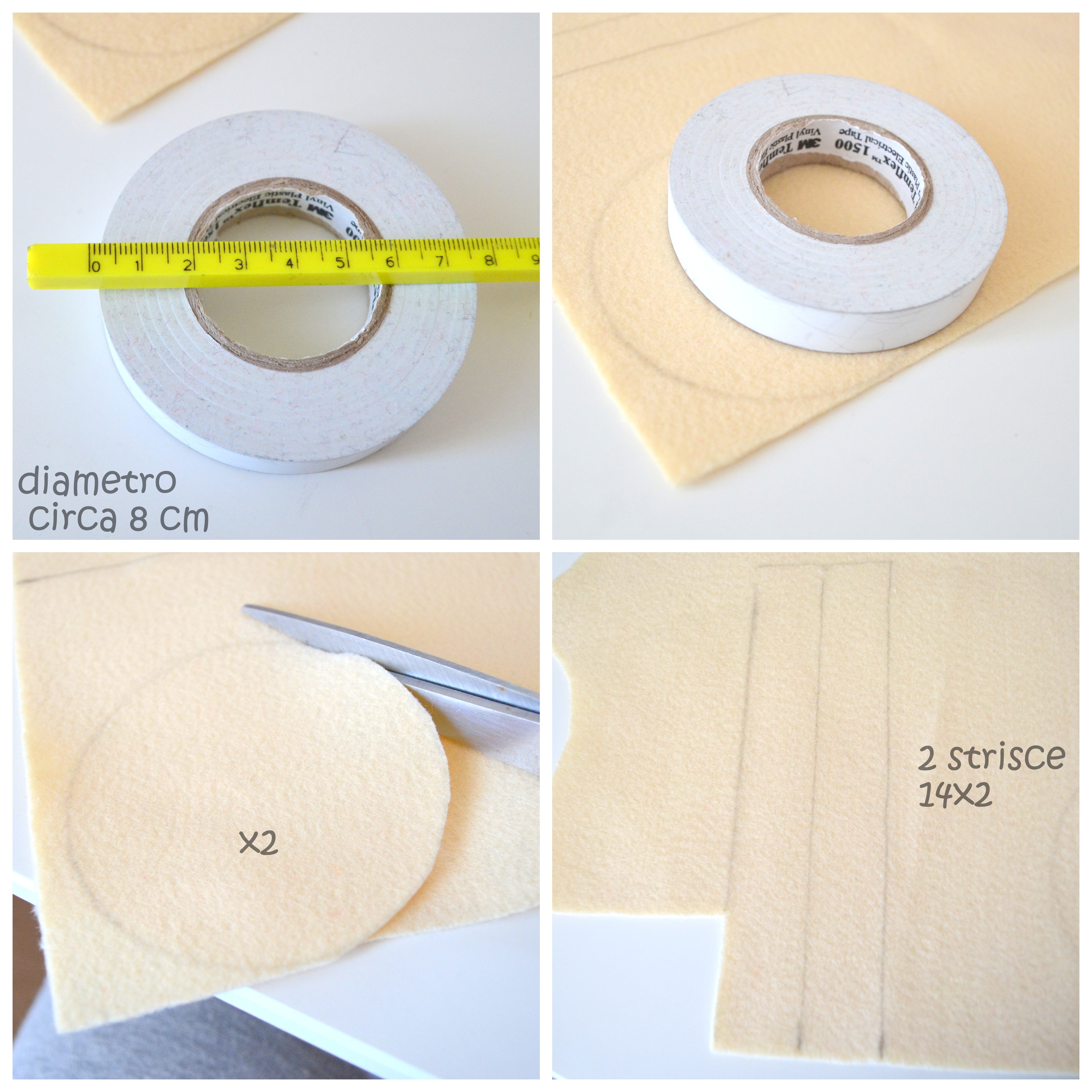 Per cominciare vi basta avere degli scampoli di feltro sottile o pannolana di due colori diversi ma abbinati, magari traete spunto dai veri macaron dato che ovviamente uno servirà per creare il biscotto e l’altro per il ripieno. Per creare il cerchio io sono andata per tentativi, all’inizio ho usato la bocca di un bicchiere ma il macaron è venuto troppo piccolo e difficile da lavorare, alla fine ho trovato un rotolo di nastro isolante del diametro di circa 8 cm per tracciare le due sagome sul panno