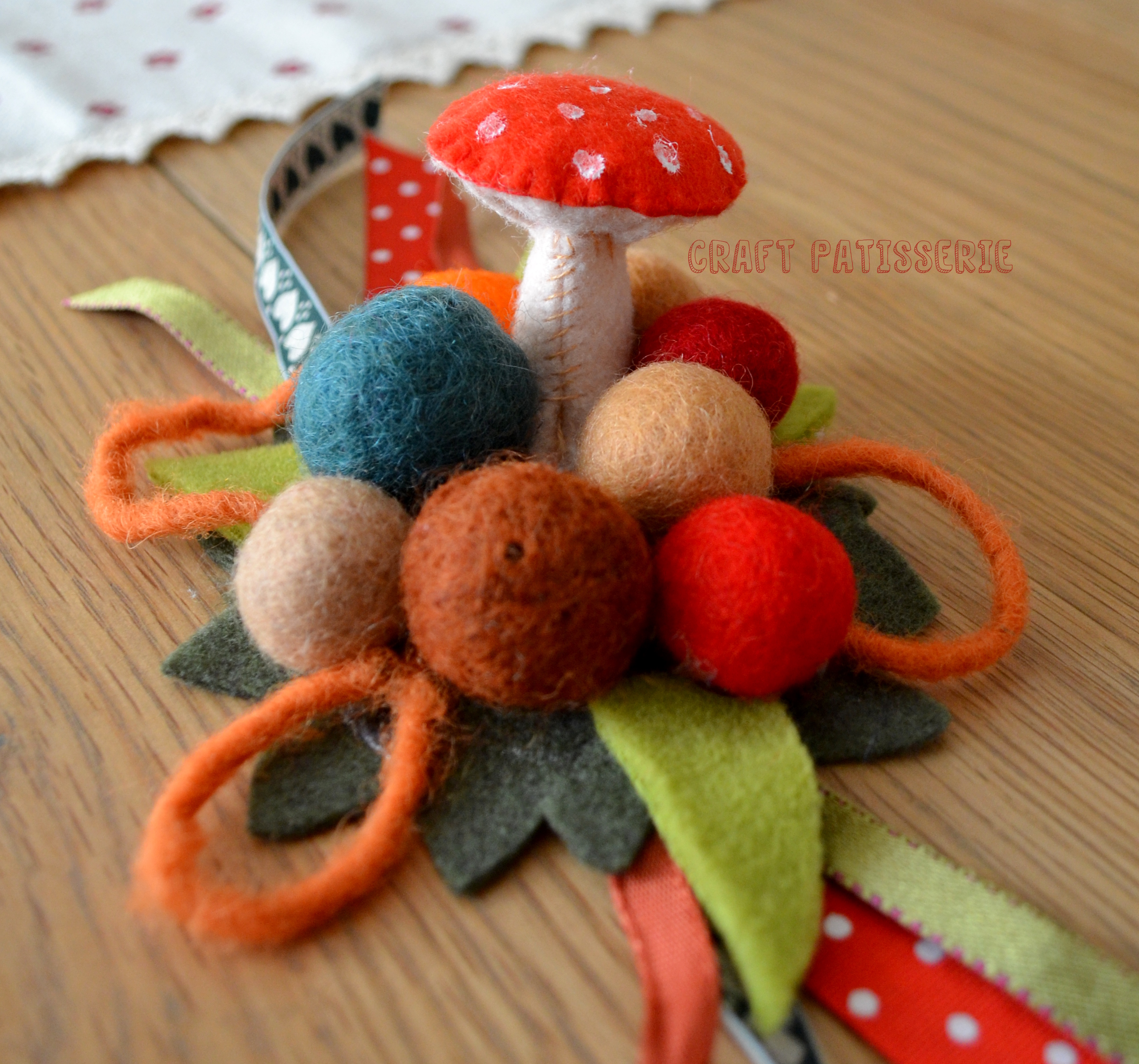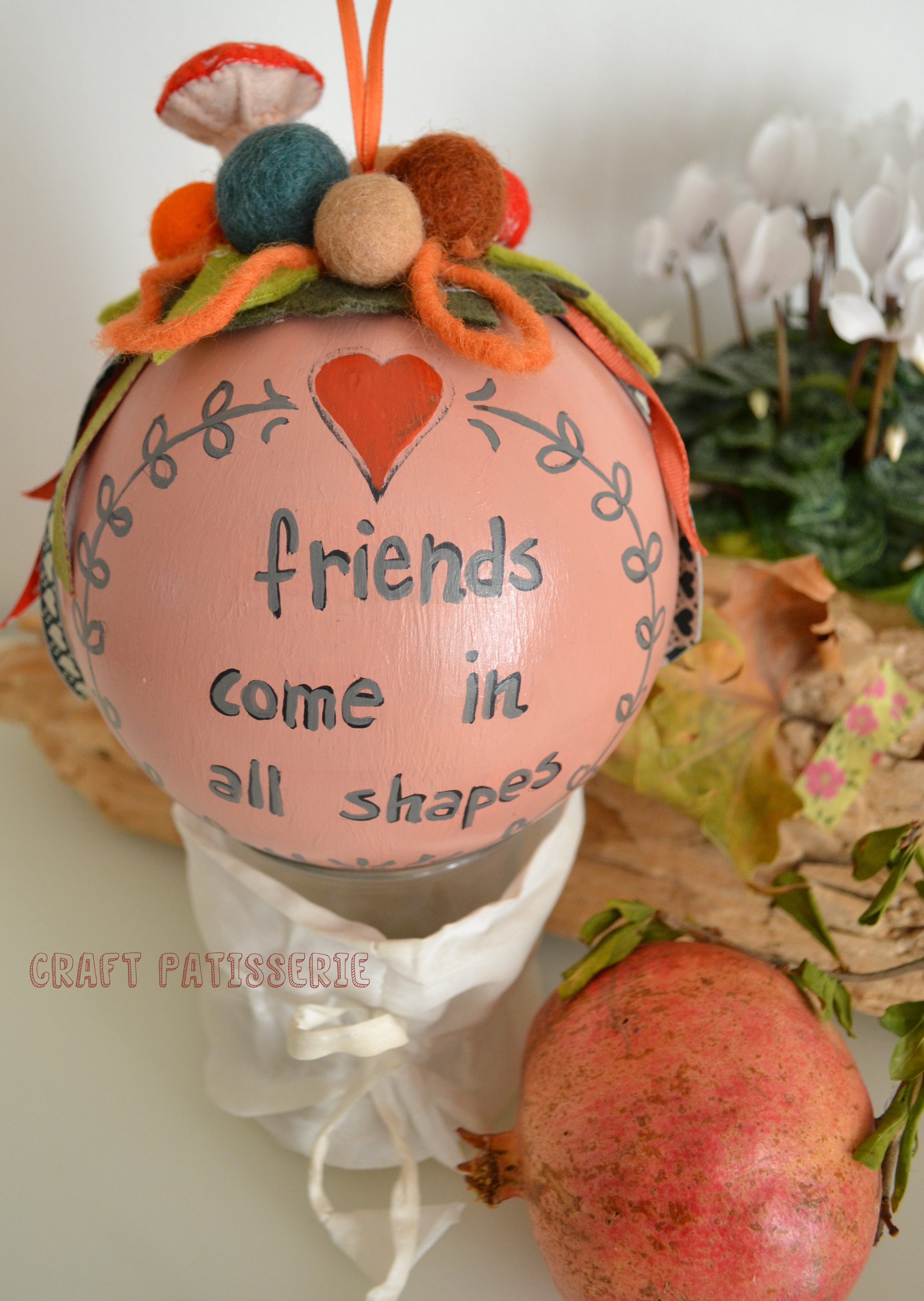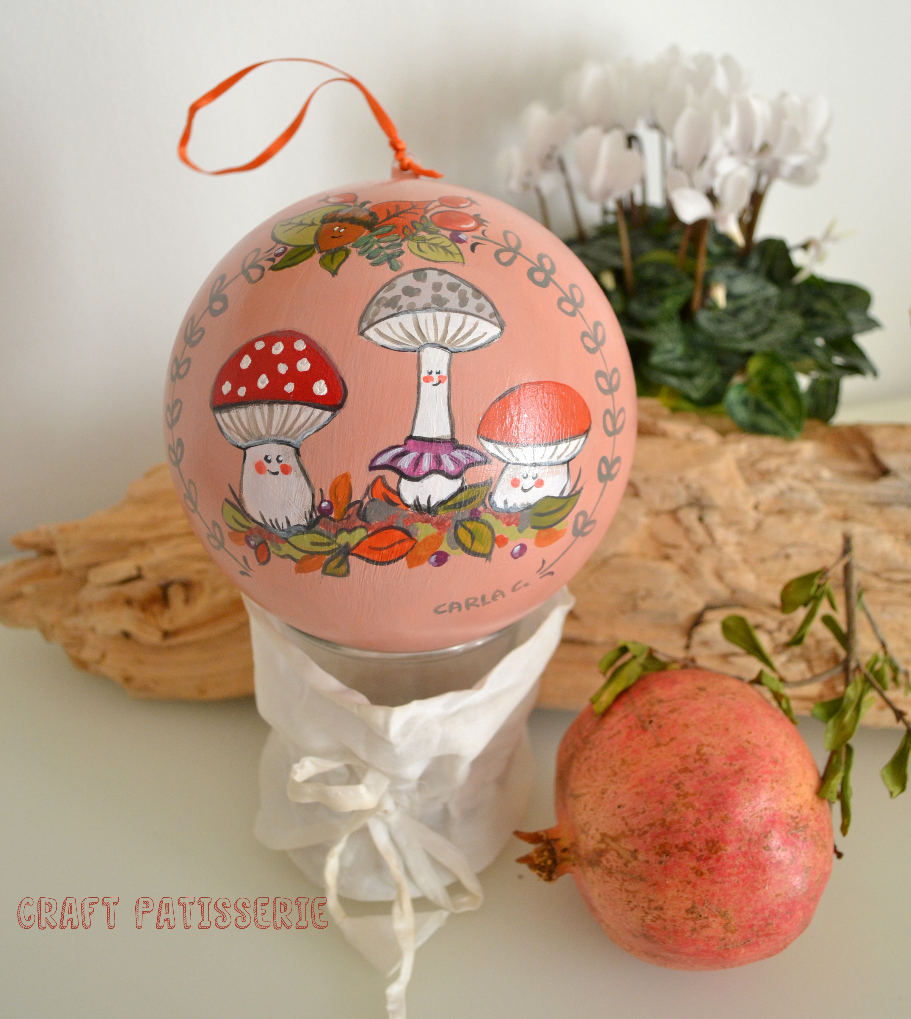 Per motivi di spazio ho ingrandito la scritta e l’ho piazzata sul retro palla 🙂 . Il risultato mi soddisfa ! Adesso una bella spruzzata di vernice finale e poi…Come posso completare il lavoro? Mi fanno tristezza quei fiocchi sghembi che solitamente sono usati per nascondere l’attacco della palla (lo so perchè ne ho fatti tanti anch’io) … allora ho avuto l’idea di realizzare con il feltro, un simpatico decoro che, a guardarlo bene, potrebbe trasformarsi in una spilla per cappotto o meglio per un cappello.  Ho pensato poi di cucire un fungo amanita con il panno lana (improvvisando) , l’ho imbottito e con l’acrilico ho dipinto le caratteristiche macchie bianche da fungo velenoso, ho arricchito con nastrini in tinta  e … Tà dààààà! Ecco fatto, vi piace??