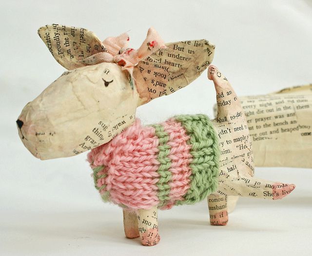 …questo cane e quest gatto con vestitini a maglia e fiocchetti in testa di questa artista Dneese e sopratutto il modo fiero con cui il cane alza la zampetta!! (blog qui)