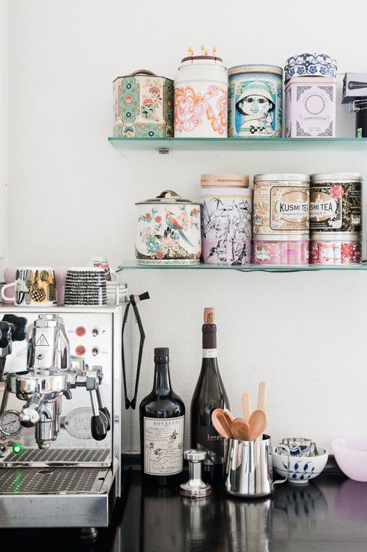 La mensola: in cucina se avete poco stazio ma una parete a disposizione allora potete alloggiare lì il necessario per tè o caffè. Ad esempio un contenitore in legno di recupero e elettrodomestici di design si fondono insieme per un effetto wow!