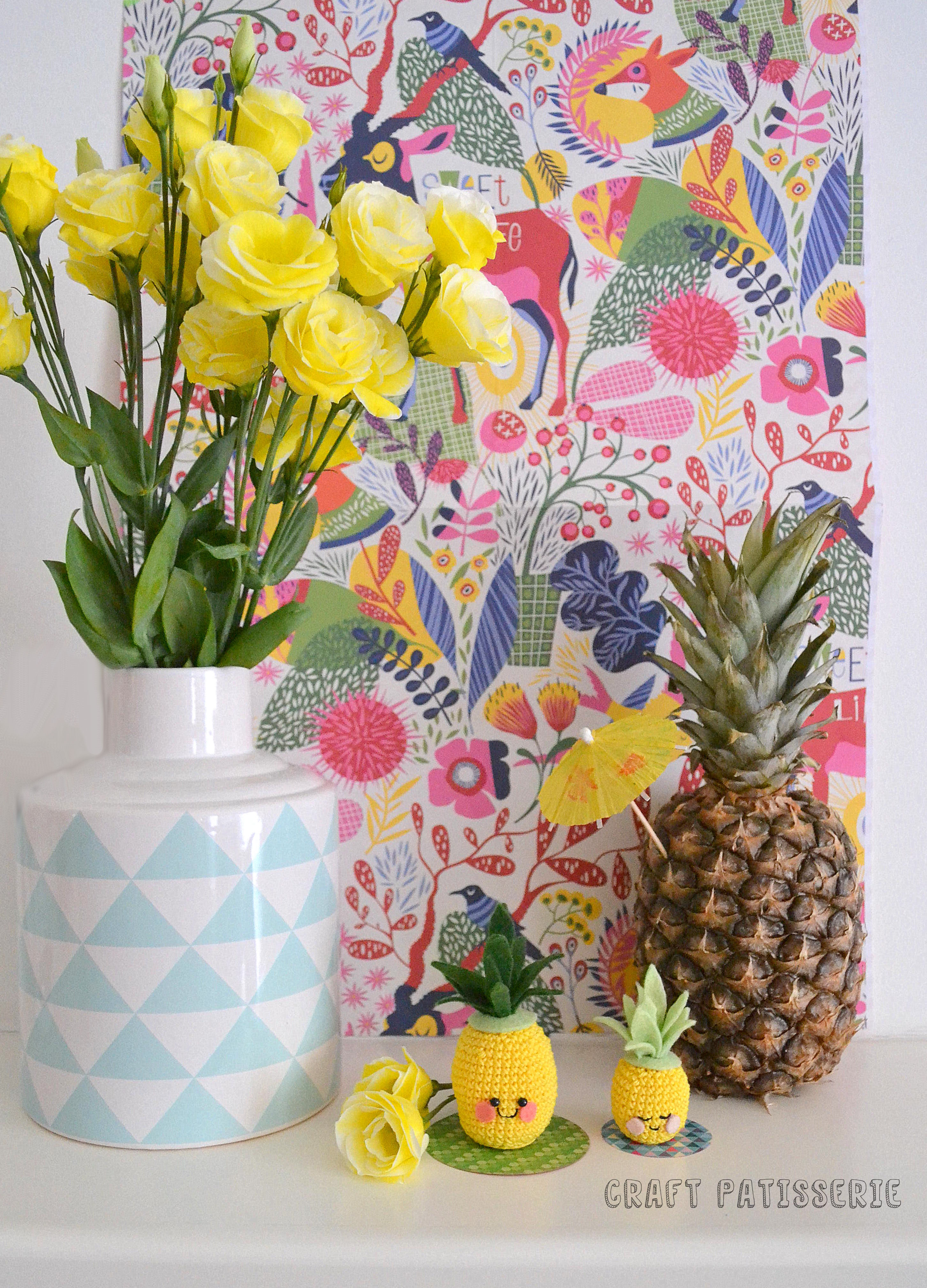 Per realizzare gli Ananassoli ho usato cotone spesso da uncinetto n.3 e panno lana per le foglie, poi mi sono divertita tantissimo con lo styling; l’ananas, il vaso con i bellissimi Lisianthus gialli screziati di bianco e forse hai riconosciuto la carta ricevuta un po’ di tempo fa in regalo direttamente da Emma Lamb e Flow magazine con le illustrazioni magnifiche di Helen Dardick.