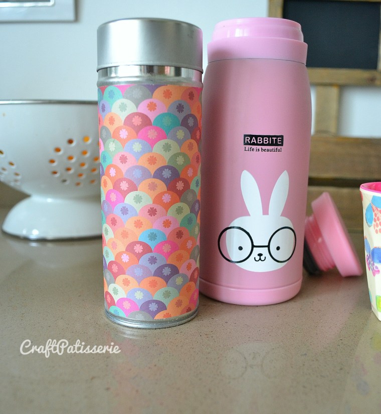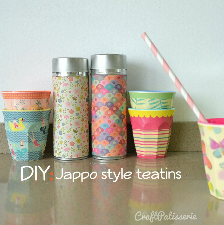 E’ bastato rimuovere la pellicola esistente e usarla come sagoma per ritagliare un po’ di carta a fantasia. Sarebbe stata perfetta una carta di riso con motivi giapponesi proprio come quelle che si vedono sui barattoli, in vendita nei negozi di tè più forniti. Io ho usato delle graziose carte da origami con fantasie a ventaglietti e a fiori, comunque adatte allo scopo.