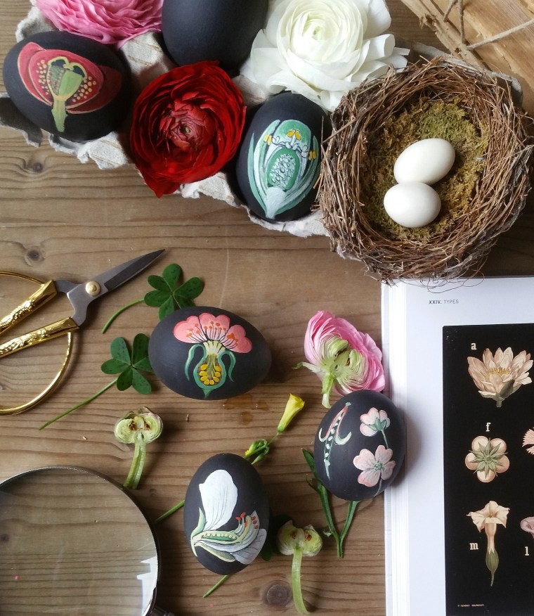 Per questo progetto l’uso dei colori è importante come la scelta dei soggetti da dipingere. Il nero usato come sfondo per far risaltare i colori delle tavole botaniche mi ha conquistata, e questo mi ha fatto pensare alla vernice lavagna che ho quindi scelto come fondo che ho steso su delle comuni uova di gallina che ho precedentemente svuotato. L’operazione di svuotamento prevede di praticare due fori ai due ‘poli’ dell’uovo, io ho usato un piccolo trapano di precisione e poi ho soffiato via il contenuto. Le uova vanno comunque lavate sia prima che dopo e lasciate asciugare. In alternativa potete usare uova di legno o acquistare delle uova già svuotate.