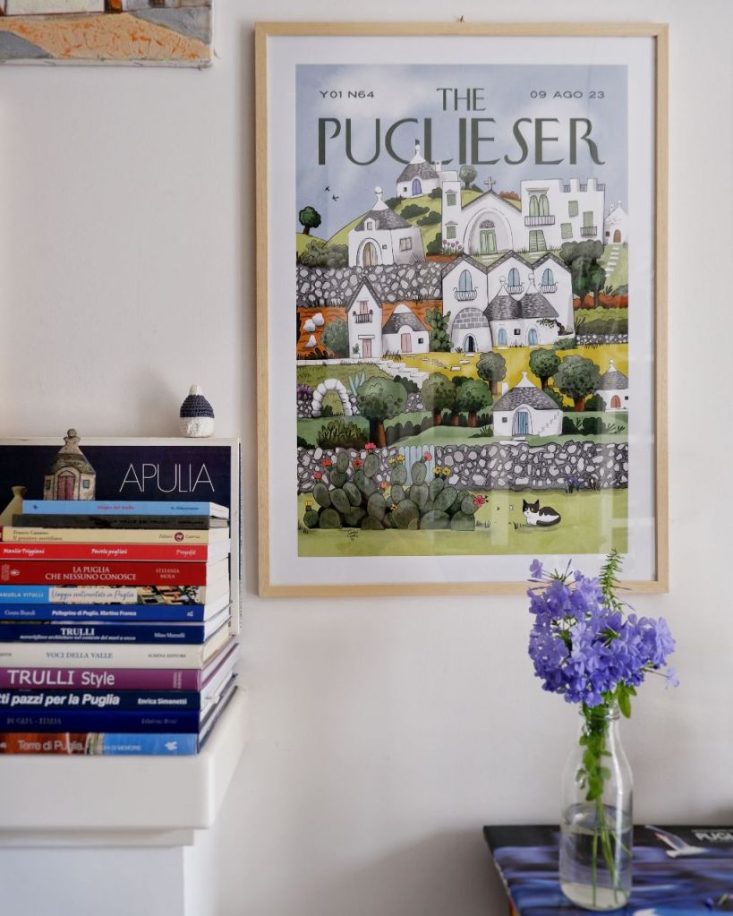 La mia idea era quella di rappresentare la Valle dei trulli, areale più esteso che include la rinomata Valle d’Itria, e che comprende le tre province di Bari, Brindisi e Taranto laddove con estrema grazia si incontrano. La mia illustrazione è un tributo ai borghi e alle contrade che tanto del mio cuore hanno conquistato con quel loro modo unico di creare il connubio tra campagna e città.