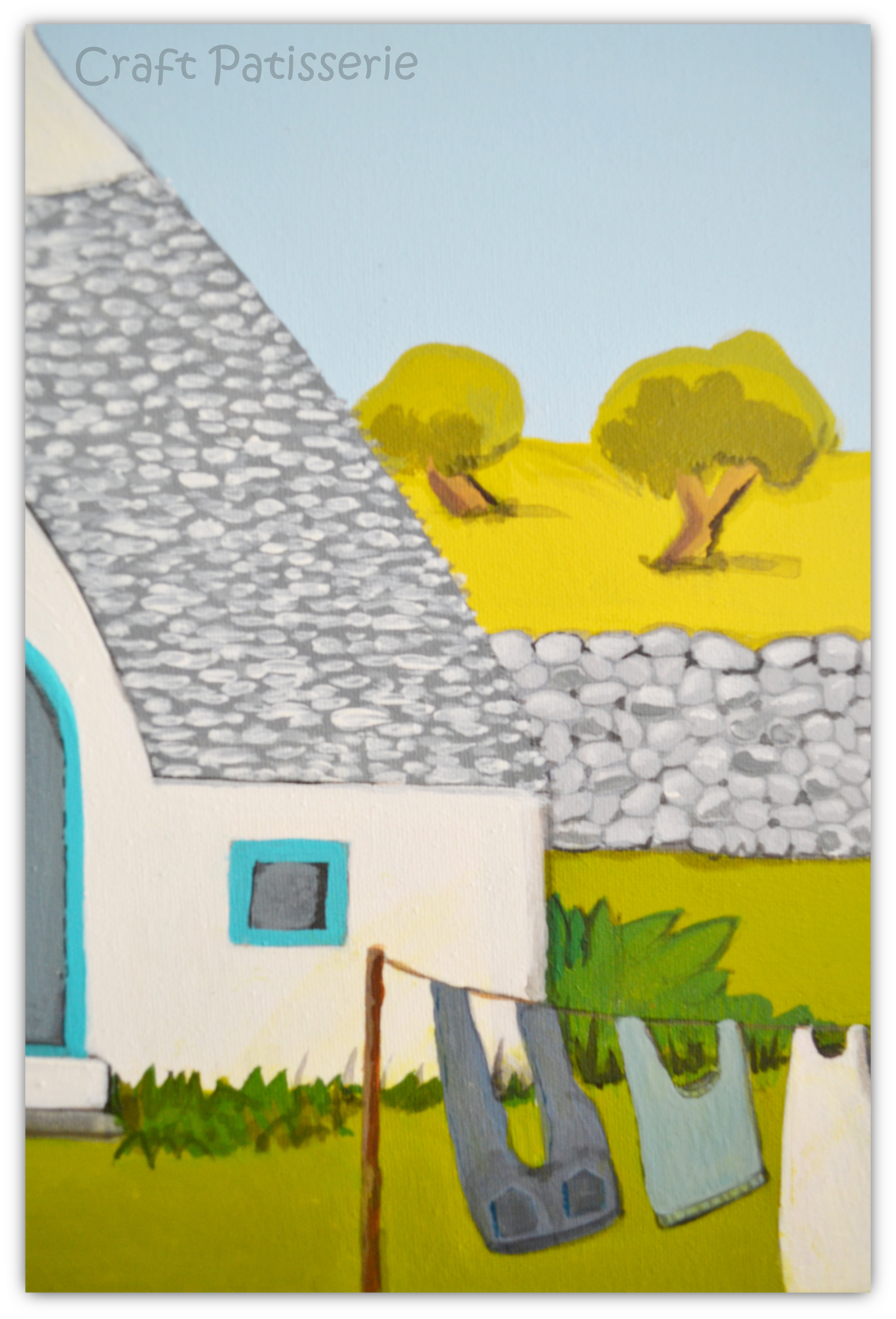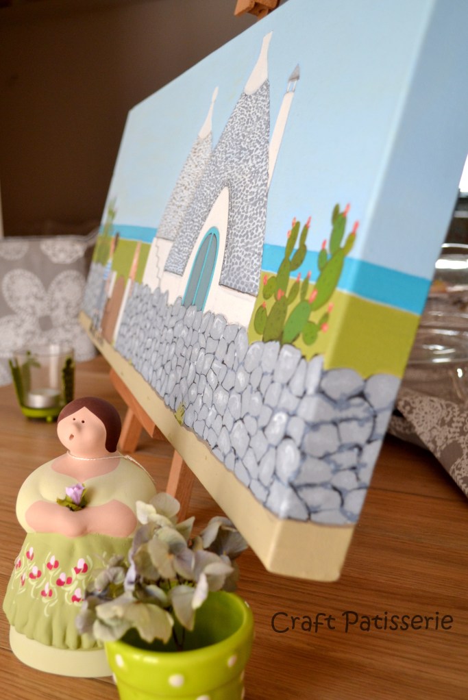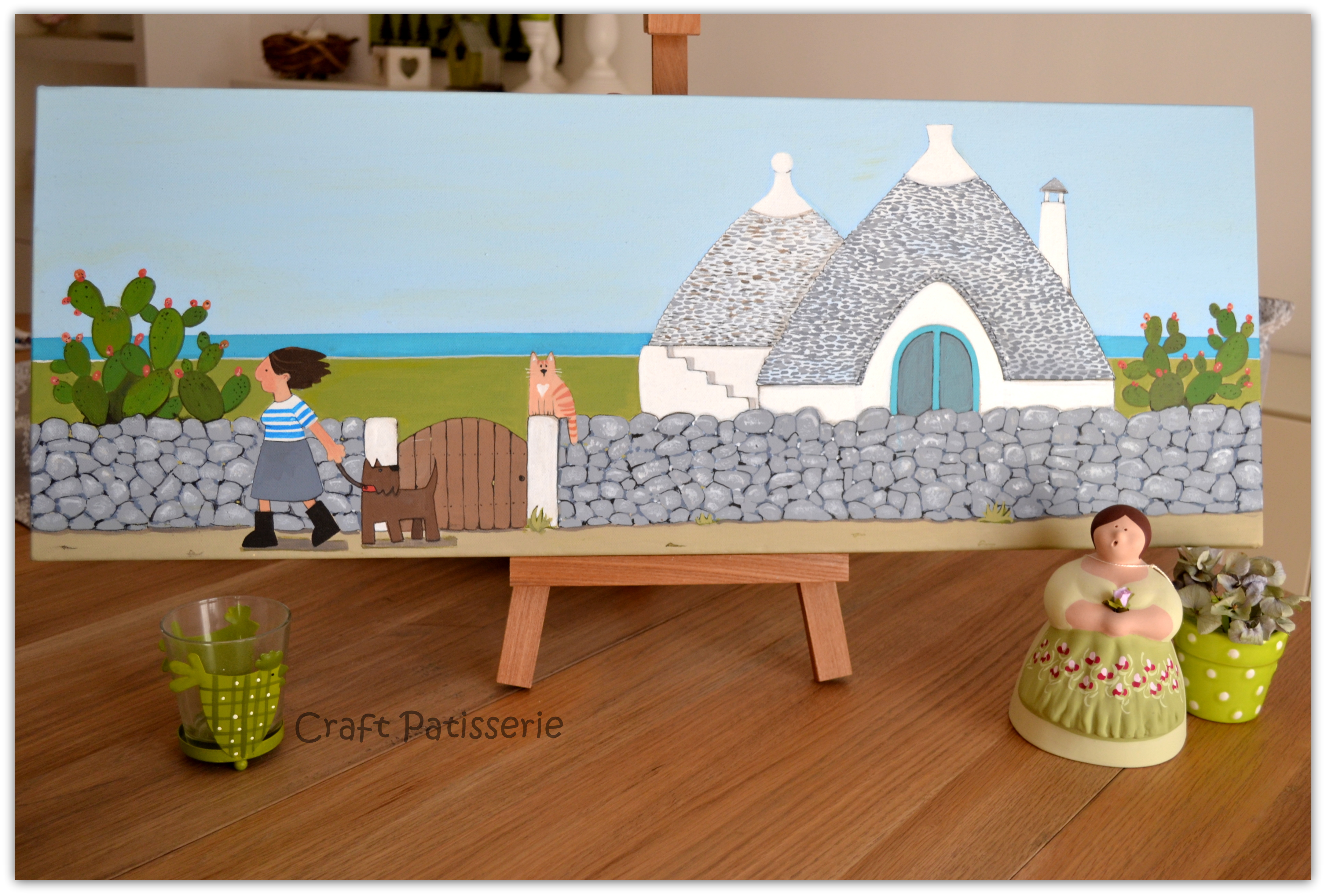 Ciao a tutti! Non so se l’ho già detto ma io sono pugliese… e campanilista per giunta! Si sa la Puglia è bellissima e potrei stare qui a parlare di clima, di gente, di posti meravigliosi per ore; ma se devo scegliere una, dico una sola, cosa che la rappresenti, bè quello è il trullo! Se qualche genio della lampada venisse a concedermi tre desideri uno sarebbe un bellissimo trullo tutto per me, immerso nella campagna ma sufficientemente vicino al mare, la mia location ideale! Mentre sogno mi sono decisa a dipingerlo: un lungo e basso mutretto a secco che nasconde tante lucertoline, solido ma basso così si può vedere al di là; i due trulli fusi con la loro calce bianca e col loro inconfondibile tetto conico, la pianta di fico d’india con tanto di frutti spinosi ma buonissimi; il mare calmo e azzurro in lontananza … e poi una scena, quasi una vignetta umoristica, con una donna che porta a spasso un cane incuriosita da un gatto fulvo che pare il padrone del trullo. Piccolo sogno che prende forma … chissà un giorno! Kiss kiss