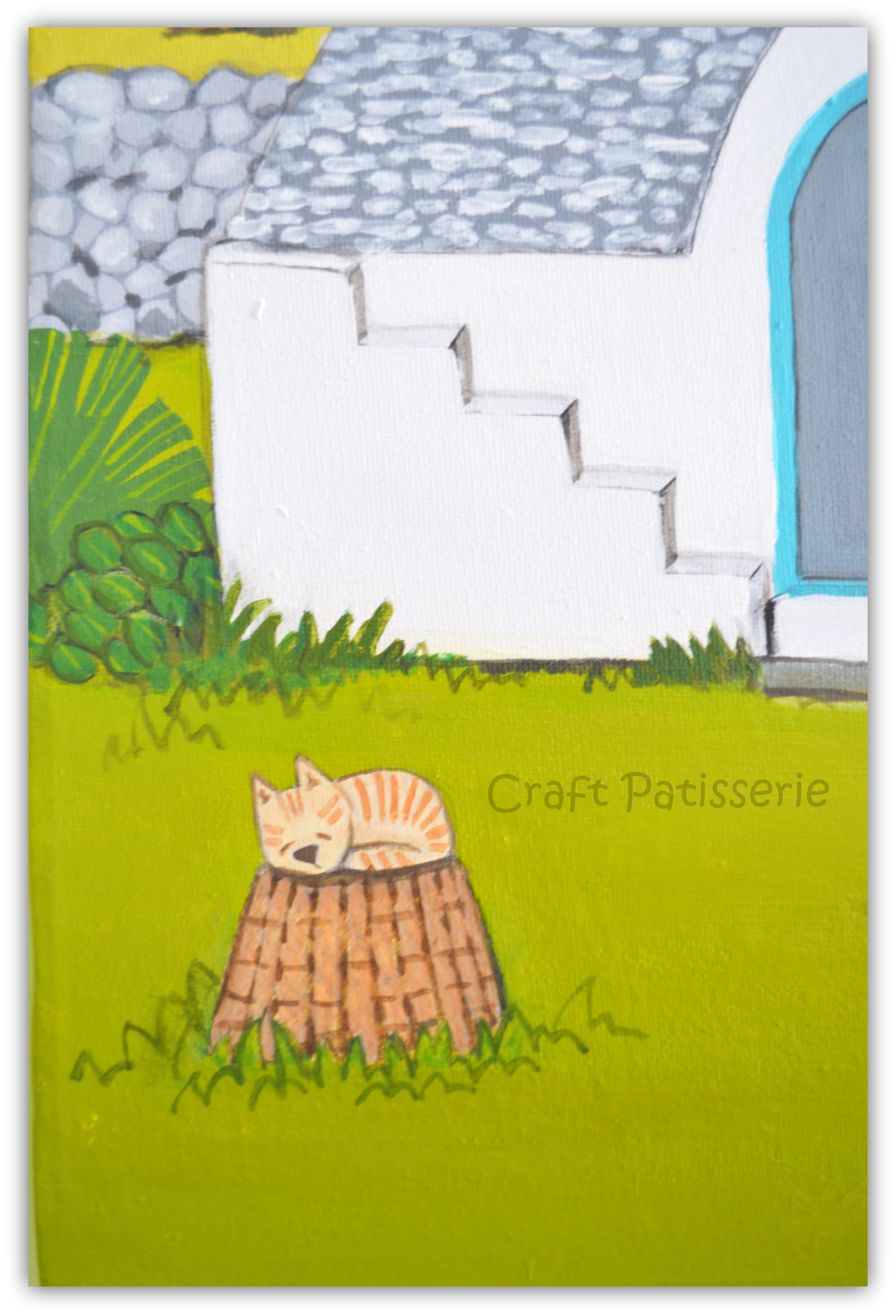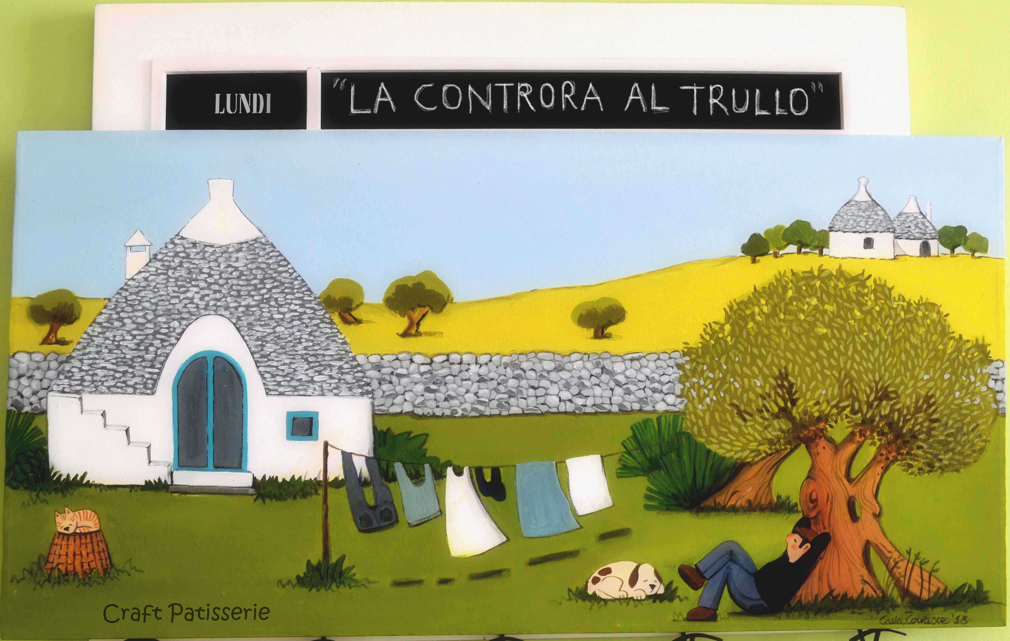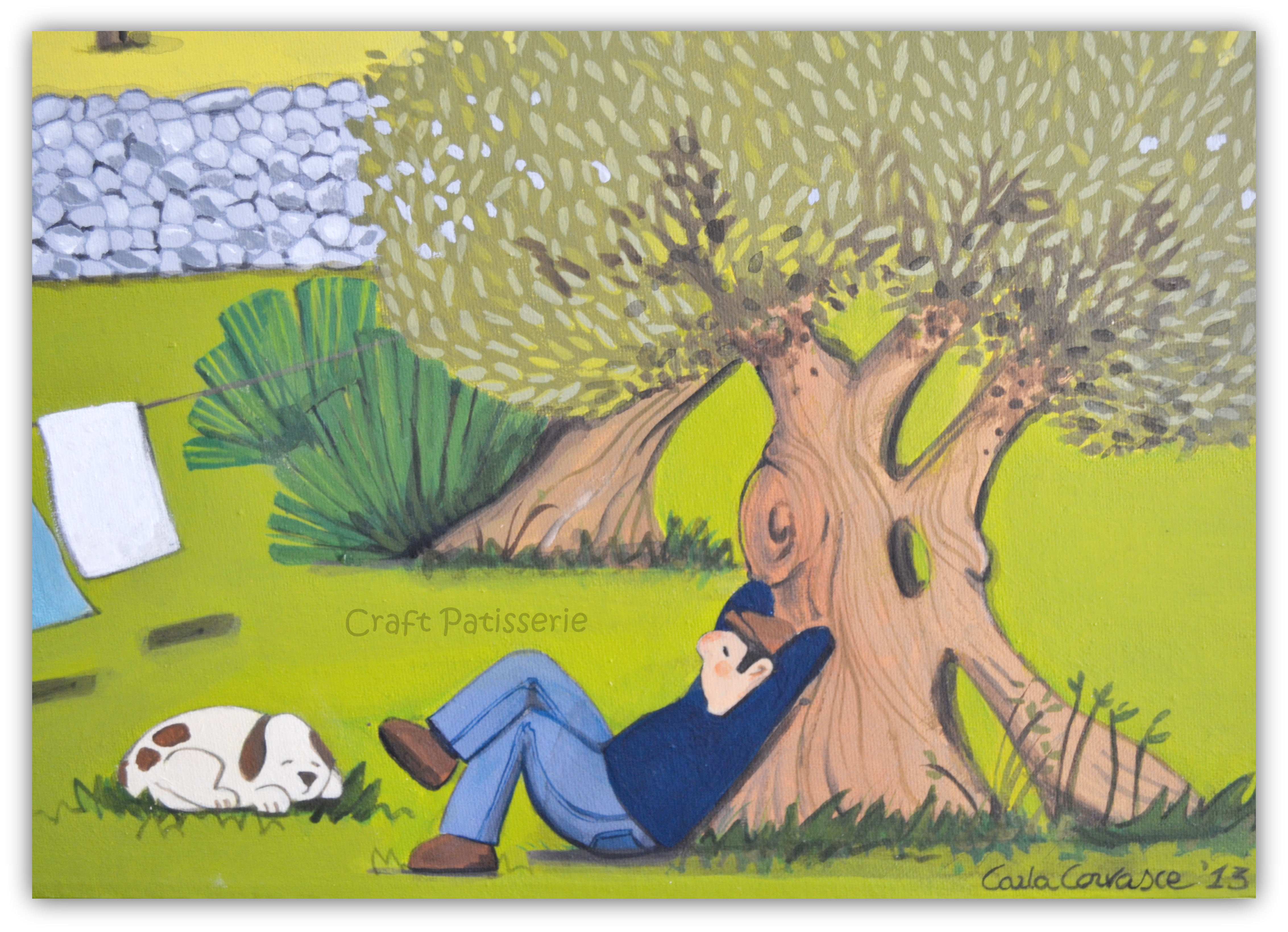 Hi everybody! I’m from Puglia and I love it! This is a very beautiful place, with nice people and fantastic weather, and the realm of the “trulli”. If someone like the genie of the lamp presented to me to grant three wishes, one of these should be owning a “trullo”. It would be in the countryside but near to the sea (ideal combo). While I ‘m dreaming about that, I decided to paint it: a low stone dry wall , prickly pear cactuses, the “trulli” with their unique roof, calm sea in the background, a woman with a dog intrigued by a cat that seems to be the trullo owner. A little dream becoming true … maybe someday! Kiss Kiss