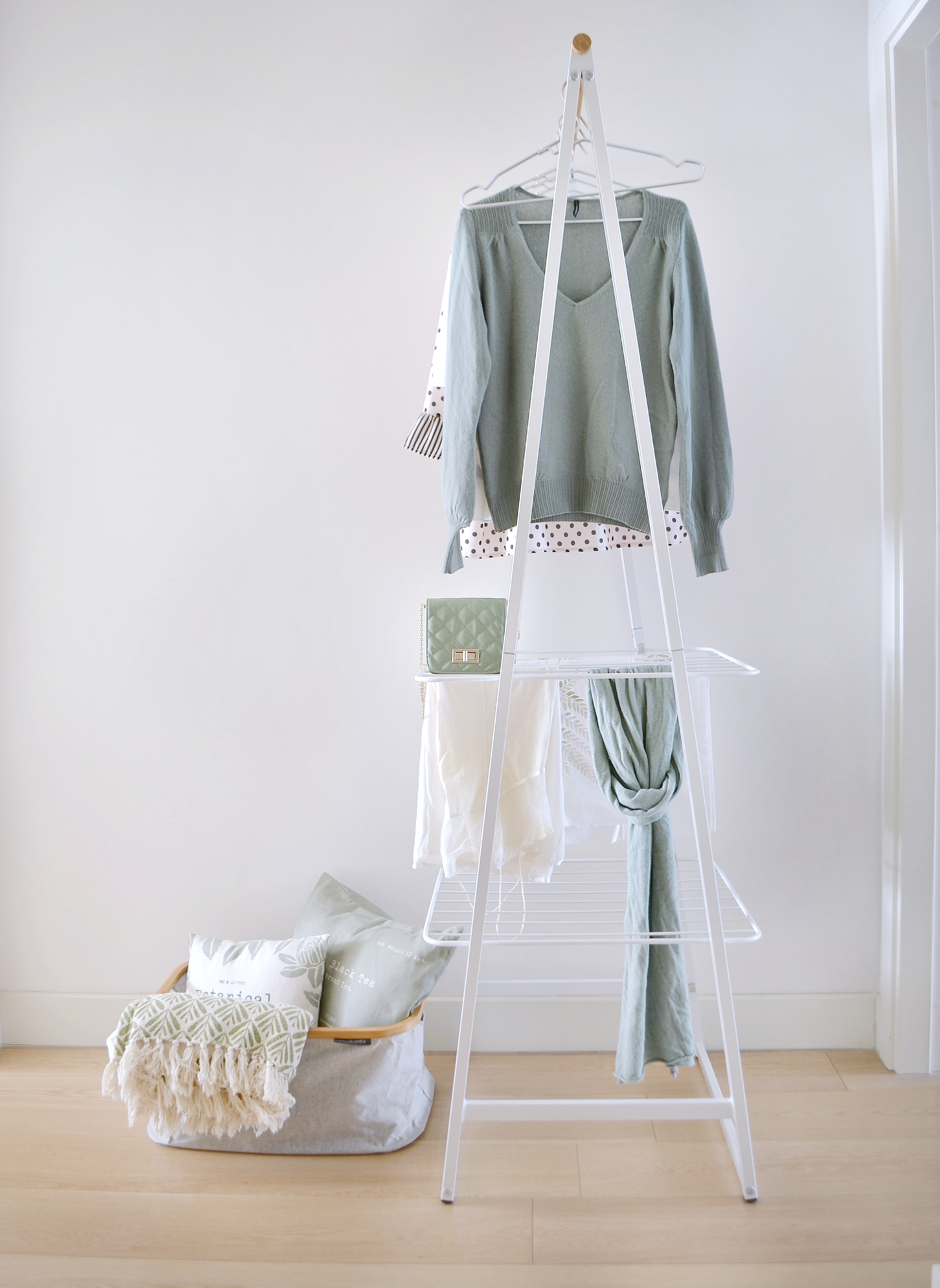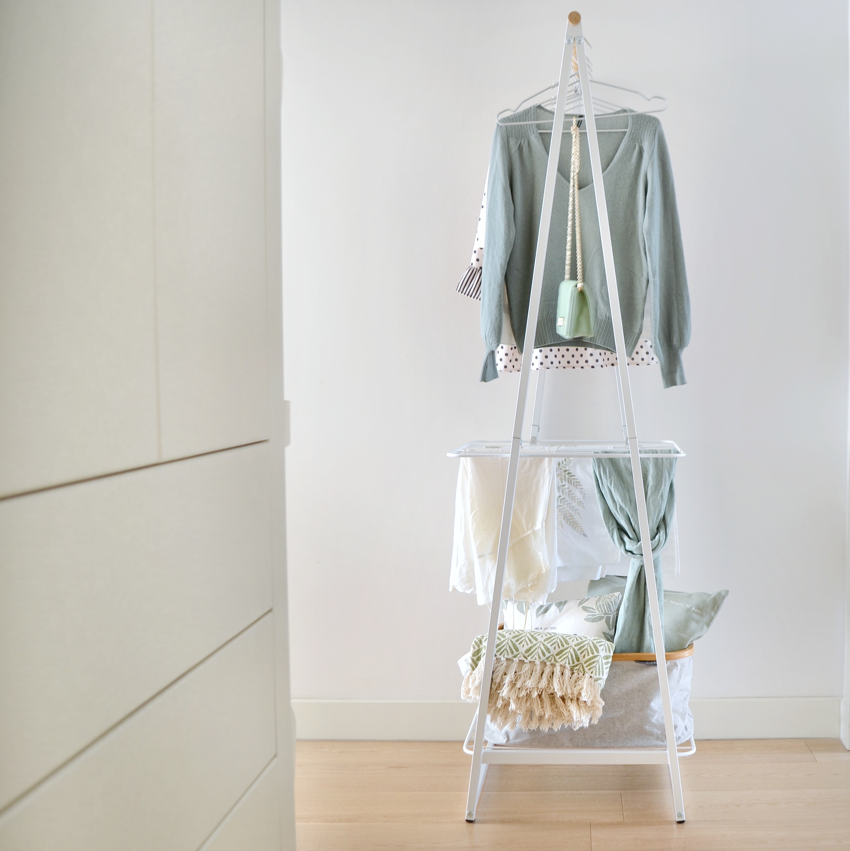 Questo oggetto così utile e versatile ha con due griglie che si possono collocare ad altezze diverse, e che in combinazione con le grucce in alluminio, furbissime perchè consentono di infilare le magliette dal collo, e il robusto cesto portabiancheria, diventa davvero un alleato perfetto per chi, come me, ha sempre sgabelli e altri supporti ricoperti di vestiti semistirati, semipuliti o semiscuciti. Ma insieme alla sua versatilitá il punto fi forza di Linn è la sua bellezza, il suo design dalle linee pulite lo rende piacevole da vedere in qualsiasi ambiente della casa.